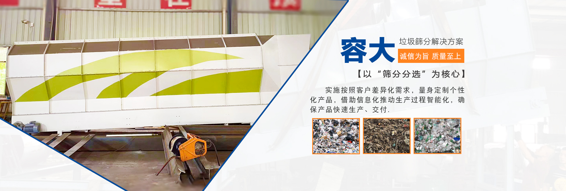 泉州容大機(jī)械有限公司是一家專研生活垃圾分選的企業(yè),以“篩分分選”為核心,實(shí)施按照客戶差異化需求,量身定制個(gè)性化產(chǎn)品,柔性化生產(chǎn)管理模式,以智能制造為主攻方向,以客戶需求為中心,借助信息化推動(dòng)生產(chǎn)過(guò)程智能化,確保產(chǎn)品快速生產(chǎn)、交付。生活垃圾處理領(lǐng)域內(nèi)的技術(shù)研究,利用篩分、分選技術(shù)的核心競(jìng)爭(zhēng)力,圍繞“智能、高效、節(jié)能、環(huán)保”八個(gè)大字為中心,為循環(huán)經(jīng)濟(jì)項(xiàng)下的各種生活垃圾處理項(xiàng)目提供成套的技術(shù)解決方案 ...